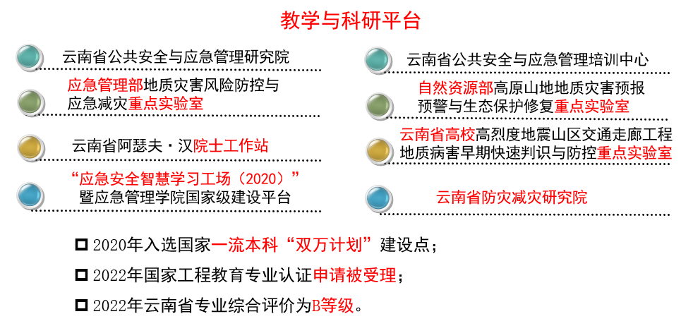 学院现有安全工程1个国家级一流本科专业,该专业于2002年招收首届本科生,2004年开始招收硕士研究生,2011年获安全科学与工程一级学科硕士学位授予权,现已建成安全科学与工程一级学科学位硕士授权点、云南省省级立项建设一级学科博士学位授权点,在全国第五轮学科评估中被评为C-等级,2020年入选国家一流本科“双万计划”建设点,2023年通过了全国工程教育专业认证,在云南省专业综合评价中被评为B-等级。目前,学院具有“云南省公共安全与应急管理研究院”与“云南省公共安全与应急管理培训中心”两个省级平台,同时具有云南省防灾减灾研究院、应急管理部地质灾害风险防控与应急减灾应急管理部重点实验室、自然资源部高原山地地质灾害预报预警与生态保护修复重点实验室、云南省阿瑟夫·汉院士工作站、云南省土木工程防灾重点实验室、云南省高校高烈度地震山区交通走廊工程地质病害早期快速判识与防控重点实验室等多个省部级科研与教学支撑平台,且获批了国家首批“应急安全智慧学习工场(2020)”暨应急管理学院国家级建设平台(首批19所,西部唯一)。日本女优